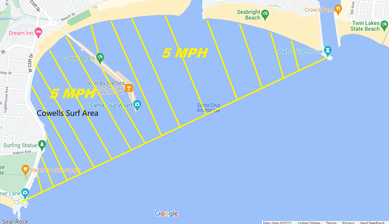 Don’t risk a total foil ban by being anywhere near the 5 MPH zone with a motorized foil. There are plenty of spots where you can e-foil south or north of Santa Cruz where law enforcement will probably not have an issue with it. You can only foil Cowells under human power (paddling).